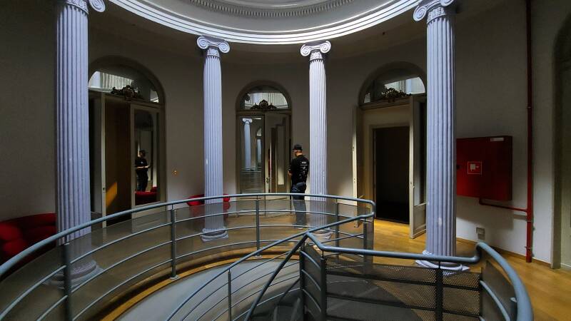 Vervolgens trokken we naar ons appartement in de Hoogpoort. Sleuteltje uit het kastje, naar boven, en daar stond ons een verrassing te wachten. Een prachtige ronde inkomhal met spiegels op alle deuren – precies een filmset! Het appartement zelf was ook dik in orde, ruime kamers en grote bedden, die zouden we nodig hebben.