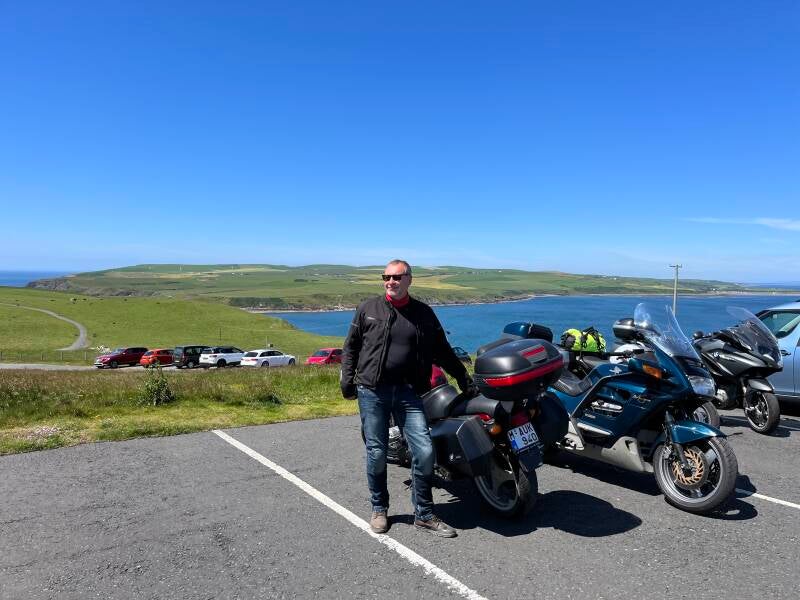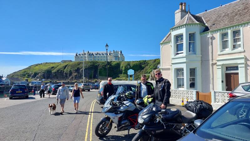 Onze eerste "geplande" stop is Mull of Galloway, het meest zuiderse punt van Schotland. We komen de heuvel afgereden van Alticry en worden beloond met een prachtig zicht op de kust van Newton Steward en besluiten hier even halt te houden om van de rust en het zonnetje te genieten. Alle motors op hun pikkel, en kijken vooruit naar de rotskust en zee terwijl zich er een klein drama achter ons afspeelt. Blijkbaar is de frele pikkel van de Ducati niet opgewassen tegen de zachte schotse ondergrond en lag plots op zijn zij... Daar zijn kosten aan, pinker afgebroken, scherm gebarsten en spiegel scheef. Gelukkig haalt Johan ducktape boven en konden we de eerste hulp aanbieden. Als ik iets geleerd heb op onze reizen is allertijden ducktape, binders en ijzerdraad ter beschikking hebben voor eerste hulp.