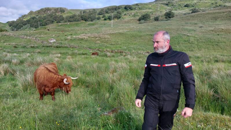 Aan Loch Awich stoppen we even om het droontje nog eens op te laten om deze prachtige omgeving vast te leggen... Gezien het prachtig zonnetje besluiten de gebroeders een duikje te wagen in het wel heel ijskoude meer. Het water van ons afgeschud vervolgen we onze weg, en ziedaar, onze schotse hooglanders lopen hier vrij rond. Hier moeten we even halt houden.